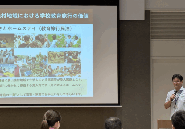修学旅行の現場を渡り歩いた事務局長による沖縄ならではの旅行先としての優位点や学生にとっての農泊の大切さなどの講話や、